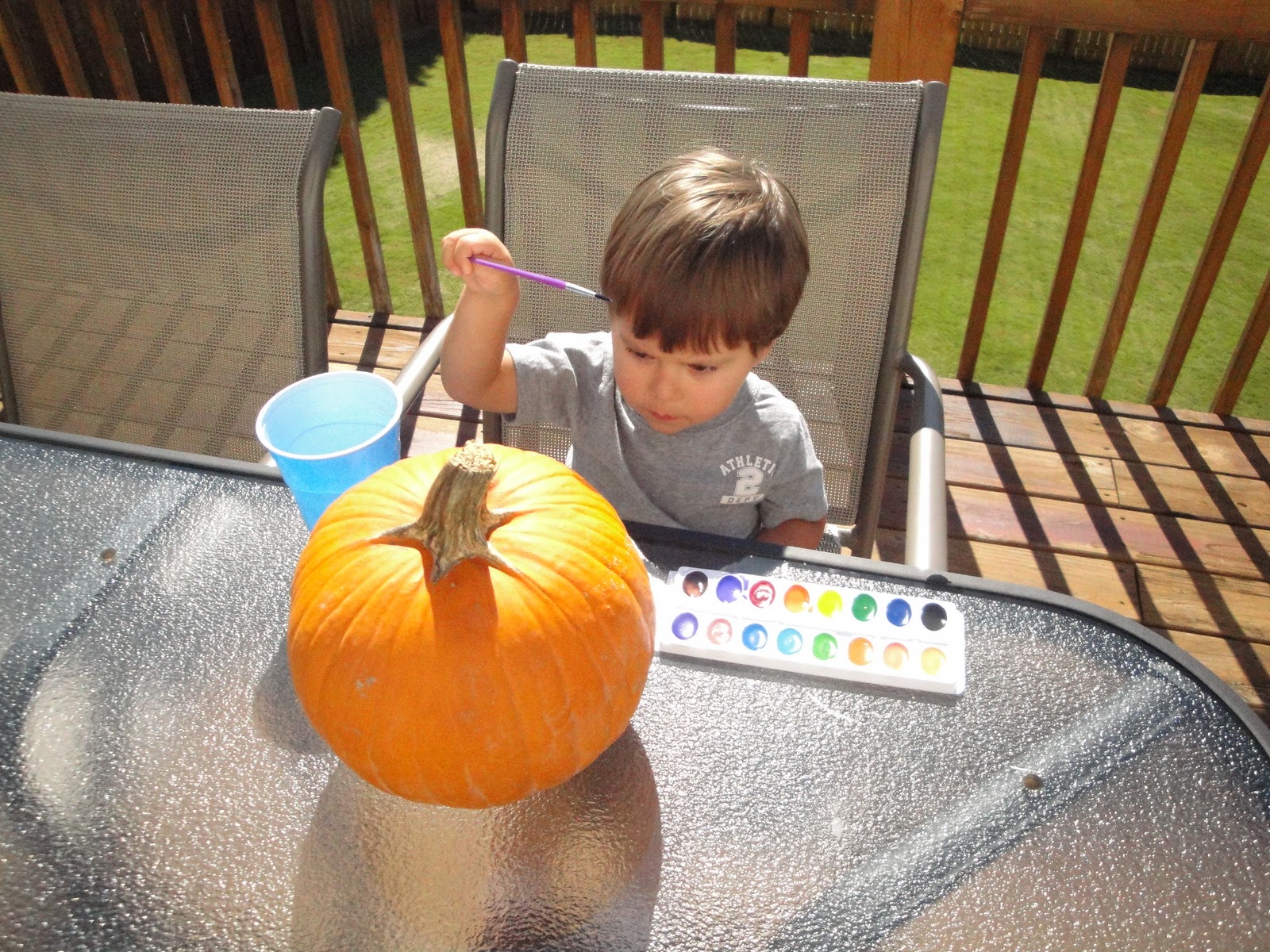 He had so much fun and did NOT want to leave. So the next weekend I thought it would be fun if we painted a pumpkin! I bought him some Crayola paint and put him outside on the deck and he went to town.